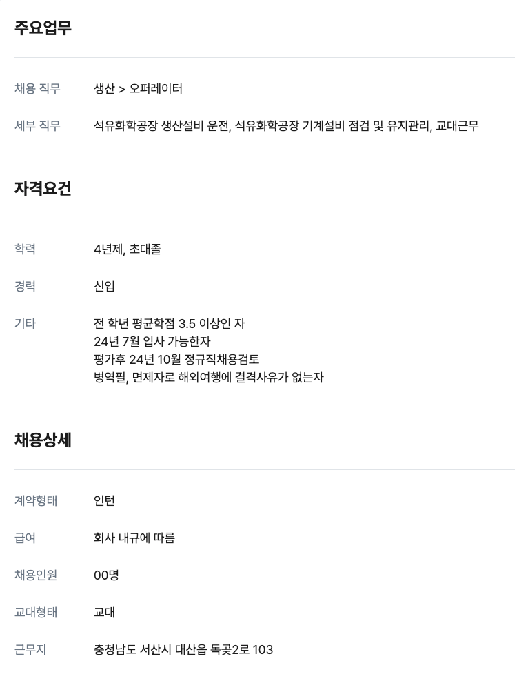 생산운전 신입 00명 인턴직 채용