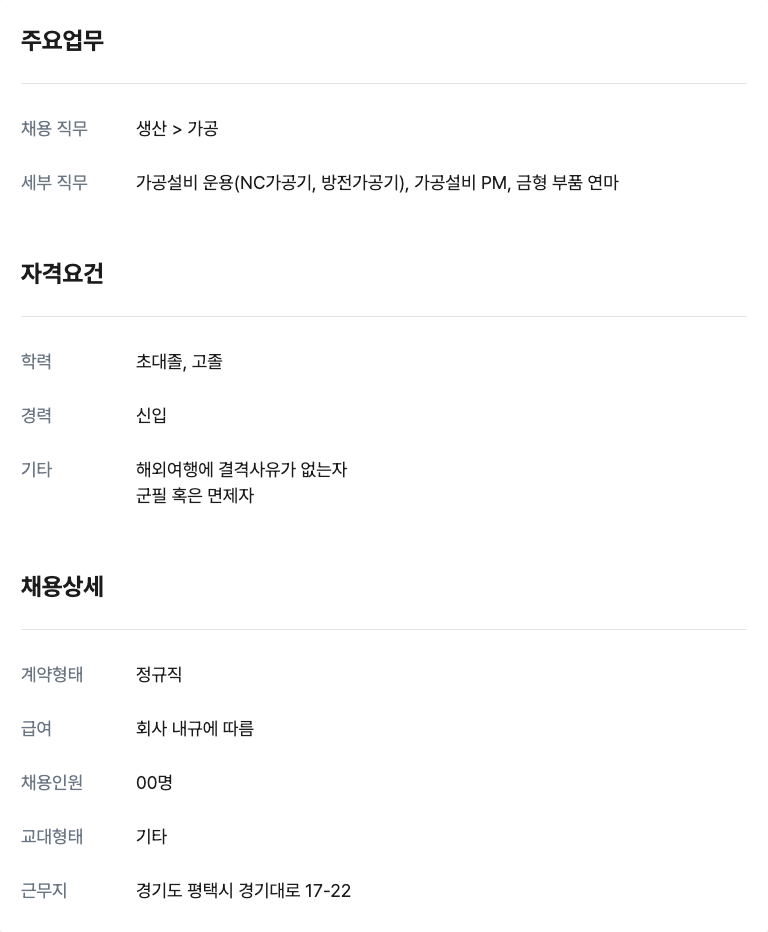 금형가공/조립 기능직 신입 00명 정규직 채용