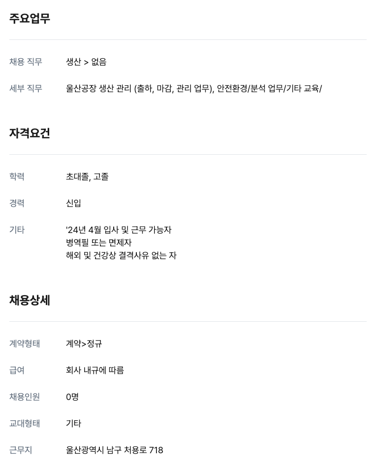 생산관리(울산) 신입 0명 채용