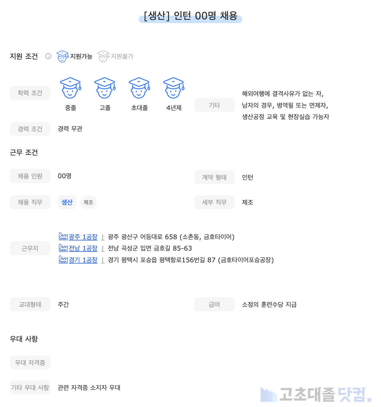 금호타이어 생산직 채용공고 - 고초대졸닷컴