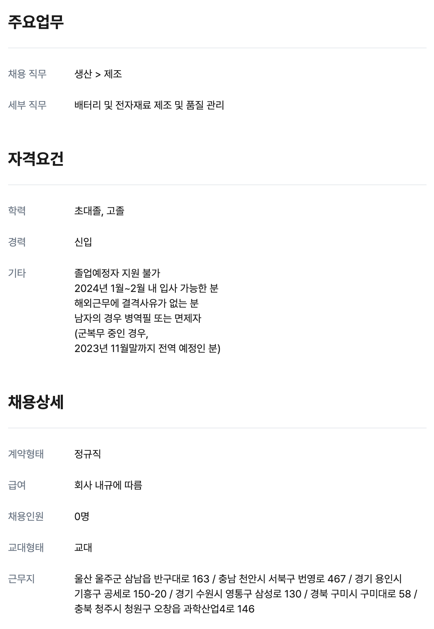 [삼성SDI] 생산 신입 0명 정규직 채용