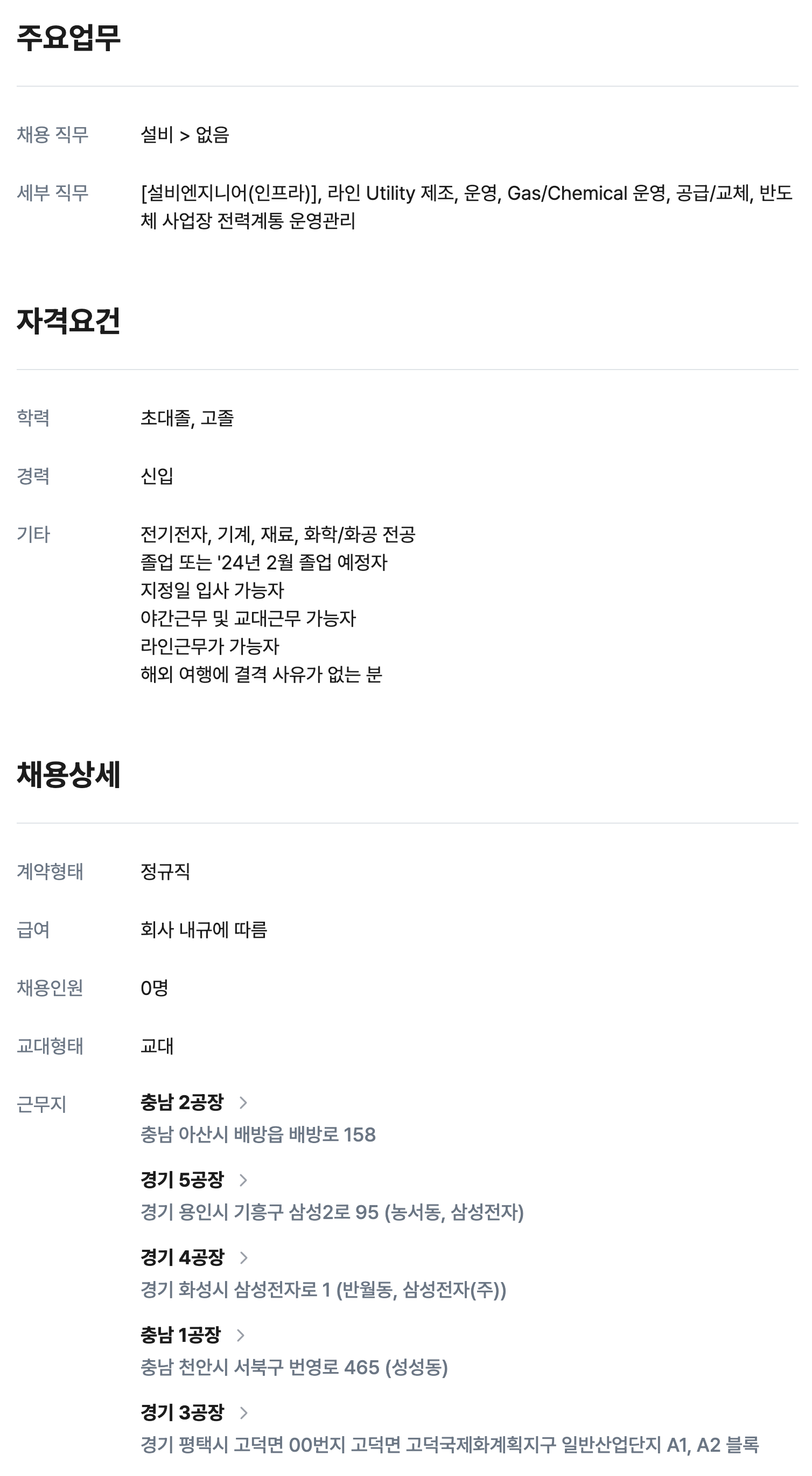 DS부문 설비엔지니어(인프라) 신입 0명 정규직 채용