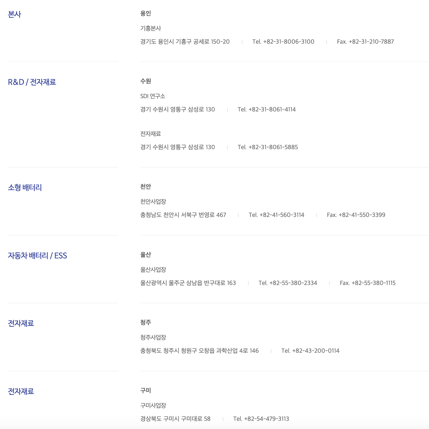 삼성 SDI는 수원시, 천안시, 울산광역시, 청주시, 구미시 등지에 생산 공장을 두고 있습니다.