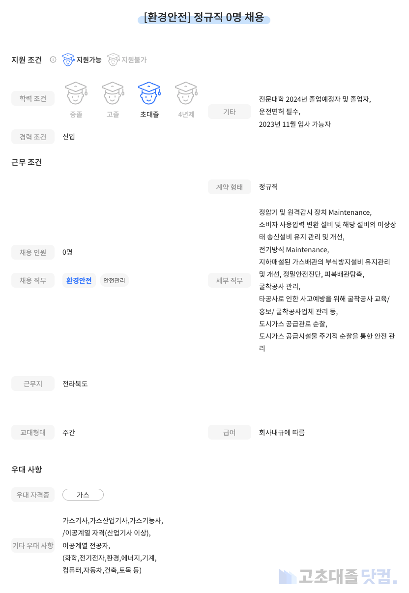 [전북에너지서비스] 안전관리 신입 0명 정규직 채용